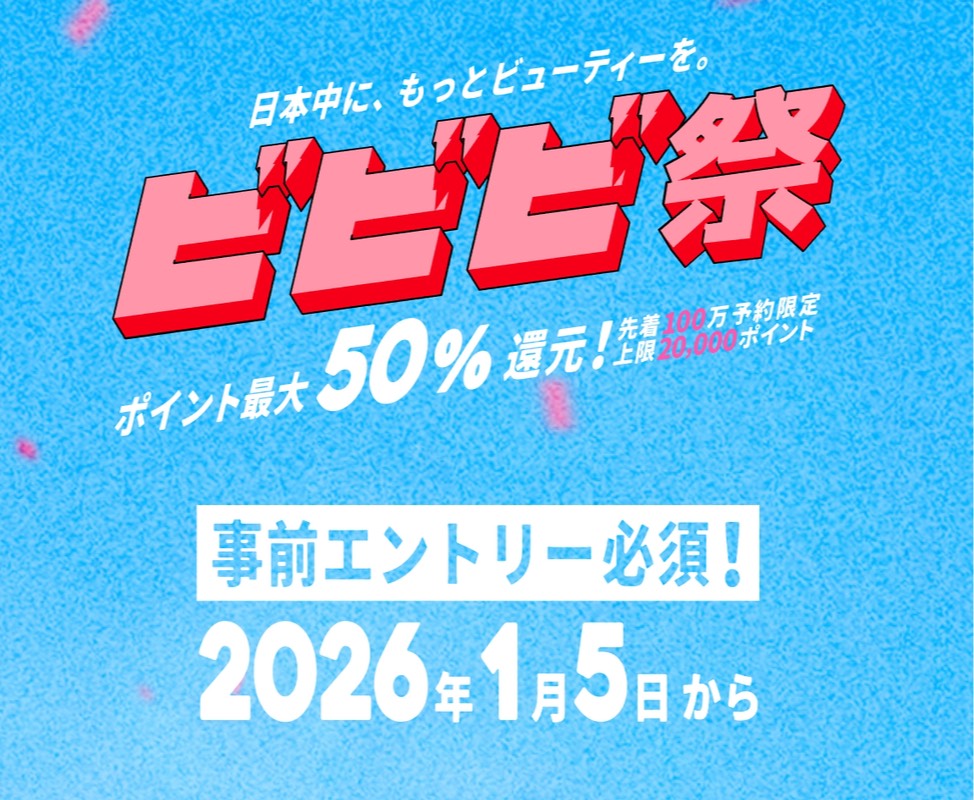 ポイント50%還元。最大2万ポイント!1月5日(月)ビビビ祭エントリースタートです。2月3月はホットペッパー予約で。